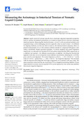 [en] <jats:p>Liquid crystal (LC) phases typically show anisotropic alignment-dependent properties, such as viscosity and dielectric permittivity, so it stands to reason that LCs also have anisotropic interfacial tensions. Measuring the interfacial tension ? of an LC with conventional methods, such as pendant drops, can be challenging, however, especially when we need to know ? for different LC aligning conditions, as is the case when we seek ??, the interfacial tension anisotropy. Here, we present measurements of ?? of the common synthetic nematic LC compound 5CB against water using a microfluidic droplet aspiration technique. To ensure tangential and normal alignment, respectively, we add poly(vinyl alcohol) (PVA) and sodium dodecylsulfate (SDS), respectively, as a stabilizer and measure ? for different concentrations of stabilizer. By fitting the Szyszkowski equation to the data, we can extrapolate to zero-stabilizer concentration, obtaining the ? of 5CB to pure water for each alignment. For normal alignment, we find ??=31.9?0.8 mN?m-1, on the order of 1 mN?m-1 greater than ?$_$=30.8?5 mN?m-1 for tangential alignment. This resonates with the empirical knowledge that 5CB aligns tangentially to an interface with pure water. The main uncertainty arises from the use of polymeric PVA as tangential-promoting stabilizer. Future improvements in accuracy may be expected if PVA can be replaced by a low molar mass stabilizer that ensures tangential alignment.</jats:p