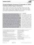 [en] Taming the magnetic anisotropy of lanthanides through coordination environments is crucial to take advantage of the lanthanides properties in thermally robust nanomaterials. In this work, the electronic and magnetic properties of Dy-carboxylate metal–organic networks on Cu(111) based on an eightfold coordination between Dy and ditopic linkers are inspected. This surface science study based on scanning probe microscopy and X-ray magnetic circular dichroism, complemented with density functional theory and multiplet calculations, reveals that the magnetic anisotropy landscape of the system is complex. Surface-supported metal–organic coordination is able to induce a change in the orientation of the easy magnetization axis of the Dy coordinative centers as compared to isolated Dy atoms and Dy clusters, and significantly increases the magnetic anisotropy. Surprisingly, Dy atoms coordinated in the metallosupramolecular networks display a nearly in-plane easy magnetization axis despite the out-of-plane symmetry axis of the coordinative molecular lattice. Multiplet calculations highlight the decisive role of the metal–organic coordination, revealing that the tilted orientation is the result of a very delicate balance between the interaction of Dy with O atoms and the precise geometry of the crystal field. This study opens new avenues to tailor the magnetic anisotropy and magnetic moments of lanthanide elements on surfaces.