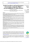 [en] Purpose: The paper investigates the market performance of strategic acquisitions for growth in the fifth and sixth merger waves and outlines the major determinants that affect the performance of acquiring companies in these most complex and most challenging corporate transactions. Design/methodology/approach: To perform the quantitative analysis a unique data sample was built out of acquisitions performed in the 5th and 6th merger waves with an only single purpose – strategic growth. Their performance was first analyzed using the method of market-based event study. In addition, the impact of several non-accounting determinants identified through a thorough literature review was tested using univariate/multivariate regression analysis. Findings: The new findings of the study state that strategic acquisitions for growth created more value for acquiring companies if they were completed internationally and involved an acquisition of a middle-sized company. Moreover, the acquisition of targets in the less related industries (2-SIC) led to stronger performance of acquirers, especially in the international settings. Research limitations/implications: The study suggests additional directions for future research. The future analysis can investigate the post-merger acquisition performance of strategic acquirers and can focus on additional financial (accounting) determinants in the evaluation of performance. This perspective can not only address the limitations imposed by the assumption of efficient capital markets but also provide additional insights. Practical implications: The results of current study have important implications for executives performing M&A for growth. They show that the market reaction to M&A announcement can be at least partially anticipated and help managers to plan their strategic moves based on a defined set of variables. Social implications: The study contributes to the sustainable, value-creating growth dynamics and encourages Executives to “lead for value.” Originality/value: (1) In contrast to the existing studies that do not differentiate between the transaction rationale in their analysis, this paper focuses explicitly only on those acquisitions that have strategic growth as their primary objective and responses therefore, to the problem stated by Halpern (1983). This approach helps to mitigate the distortion of results and make a reliable assessment of the strategic move. (2) The results of quantitative analysis also outline that acquisition of mid-sized targets and larger degree of diversification (2-SIC, international focus) code were associated with higher value creation. 研究目的: 本文旨在研究於第五和第六波的併購浪潮中為增長而作出的策略性收購的市場表現;本文亦概述在這些極其複雜的和極具挑戰性的公司交易中影響作收購公司的表現的主要因素. 研究設計/方法/理念: 為了能進行定量分析,研究人員收集在第五及第六波的併購浪潮中以策略性增長為唯一目的的收購個案、建立一個獨特的數據樣本。研究人員首先以基於市場的事件研究法分析那些進行了收購的公司的表現,並以單變量/多變項迴歸分析法去試驗那幾個透過深入的文獻研究而找到的非會計的決定因素的影響. 研究結果: 研究得出的新發現是、如果以增長為目的的策略性收購是於國際間完成及涉及收購中型公司的話,則這收購行動會給進行收購的公司帶來更多價值。而且、如果收購目標的產業與作收購公司的不太相關的話 (2-標準產業分類),收購行動會為進行收購的公司帶來更強的表現、特別是在國際環境下進行這收購行動. 研究的原創性/價值: (1) 有別於現時其它於其分析中不區分交易理由的研究,本文明確地表示只集中探討那些以帶來策略性增長為主要目標的收購;因此、本研究對 (哈爾彭,1983年)(Halpern, 1983) 陳述的問題作出了回應。本研究的理念有助於減輕我們對收購結果的曲解,從而讓我們對策略性行動能作出可靠的評估. (2) 定量分析的結果、亦概述了以中型公司為目標的收購及更大程度的多樣化 (2-標準產業分類、以國際為焦點) 代碼與創造更大價值是有關聯的。 對日後研究的作用/實際影響: 本研究的結果對學術界及管理人員均具吸引力,亦為策略規劃提供一個額外的工具. 對社會的影響: 本研究可帶來可持續的及可創造價值的增長動力,又可鼓勵行政主管採用以價值為本的領導方針.