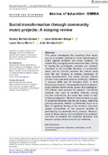 [en] This article investigates the hypothesis that music can be a powerful catalyst for social transformation within specific territorial and social contexts. To explore this, a scoping review was conducted, aiming to identify the participants, networks and contexts described in the scientific literature on community music and to critically examine the criteria used over the last 15 years to analyse processes of social transformation. The review includes original articles from specialist journals published between 1 January 2008 and 15 February 2023, in both English and Spanish. Following the selection process using defined search terms across four databases, 270 articles were selected for analysis. The NVivo software was used to facilitate thematic coding and the construction of a node tree based on key analytical categories. Notably, there has been a surge in published literature over the last 5 years, reflecting growing academic interest in community music as a field. A significant finding of this review is that most studies concentrate on the personal benefits of participating in community music projects. However, many of these studies lack comprehensive analyses and tend to overlook the collective dynamics and broader societal dimensions of such initiatives. Context and implications Rationale for this study: Music can serve as a powerful catalyst for social transformation, particularly within specific territorial and socio-cultural contexts. In recent years, the field of community music has emerged as a distinct discipline that explores how collective musical practices contribute to such transformations. As a discipline in development, community music research is continuously evolving, shaped by ongoing debates over its epistemological foundations, theoretical frameworks and diverse practical applications. Why the new findings matter: This review offers an updated and critical synthesis of the literature on community music and its role in social transformation. By identifying the main participants, networks and contextual factors described in the last 15 years of research, it provides a clearer picture of how community music initiatives are understood and evaluated. In doing so, it highlights gaps and inconsistencies in the criteria used to assess their social impact. Implications for researchers, music educators and policy-makers: The findings of this review reveal that most existing studies focus on the personal benefits derived from participation in community music projects. However, these accounts often lack in-depth analyses of broader social dynamics, such as the collective processes, contextual variables and long-term sustainability of the initiatives. There is an urgent need for more robust and multidimensional assessment frameworks that go beyond individual outcomes to encompass group interactions and community-level impacts. Moreover, future research should examine the durability of social ties created through these projects and the mechanisms by which such connections are maintained or fade over time. Addressing these questions is essential for deepening our understanding of community music's transformative potential and for informing more effective practice and policy.