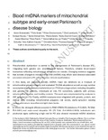 [en] Mitochondrial dysfunction is central to the pathogenesis of Parkinson's disease (PD), integrating both genetic and environmental factors. Therefore, reliable blood-based biomarkers reflecting mitochondrial alterations are needed. Emerging evidence suggests that somatic changes to mitochondrial DNA (mtDNA) may reflect early disease-associated processes relevant to PD conversion and clinical manifestation. In this study, we analysed somatic mtDNA major arc deletions as a measure of mitochondrial genome integrity and evaluated 7S DNA abundance as well as copy number as complementary readouts in whole blood (n=776) from a large cohort, including idiopathic and genetic PD patients, individuals at risk, PD converters, patients with primary mitochondrial disease, and healthy controls. This work was complemented by analyses in CSF samples (n=72). Finally, mtDNA measures were integrated with genetic, protein, and clinical data, including mitochondrial polygenic risk scores, alpha-synuclein seeding assays, and serum neurofilament light chain levels. In blood, the strongest effects occurred in PINK1/PRKN-PD (deletions: P<0.0001; 7S DNA: P<0.0001) and early-onset idiopathic PD (7S DNA: P=0.0009-0.0030). Individuals with prodromal signs conferring a high risk for PD also showed increased mtDNA deletions (P=0.0045) and reduced 7S DNA (P=0.0046). In PD converters, these alterations were detectable prior to clinical diagnosis (deletions: P=0.0024; 7S DNA: P=0.0091). In CSF-derived extracellular vesicles, we observed an age-associated increase in mtDNA copy number in healthy controls (R2=0.121, P=0.035) that was absent in idiopathic PD (R2=0.014, P=0.548). Across all PD patients, those with the highest mtDNA deletion burden and lowest 7S DNA exhibited a higher risk of developing cognitive impairment and depression, while also showing a longer time to postural instability (deletions: P=0.0187; 7S DNA: P=0.0281). Integration of mtDNA readouts, mitochondrial polygenic risk scores, alpha-synuclein seeding, and serum neurofilament light chain levels revealed complementary contributions to biological heterogeneity in PD, with receiver operating characteristic analyses showing moderate group-level discrimination using mtDNA measures alone (AUC=0.66) and substantially improved discrimination when combined with alpha-synuclein and neurodegeneration markers (AUC up to 0.96). Alpha-synuclein seeding activity was associated with later age at onset, whereas mtDNA deletion burden showed an inverse association, indicating that these biomarkers capture distinct biological dimensions of PD. MtDNA damage markers, particularly deletion burden, capture mitochondrial dysfunction arising from both genetic and environmental influences and are detectable across early clinical stages of PD. While not serving as stand-alone diagnostic biomarkers, mtDNA measures provide complementary biological information within a multimodal framework and may support patient stratification based on mitochondrial involvement using a minimally invasive approach.